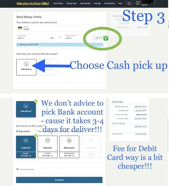 IMPORTANT: DO NOT SELECT ANY OTHER DELIVERY METHOD EXCEPT “CASH PICK UP” If you need to select the receiver city, then you should select “Dhaka” If you need to select the receiver agent name, then you need to select “Any retail partner”. If you miss this instruction, that is 90% possible we will fail to withdraw your money, thank you.